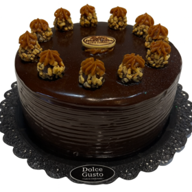 Ingredientes: Bolo de nozes, nozes crocantes e creme misto. Cobertura de creme misto e nozes crocantes.